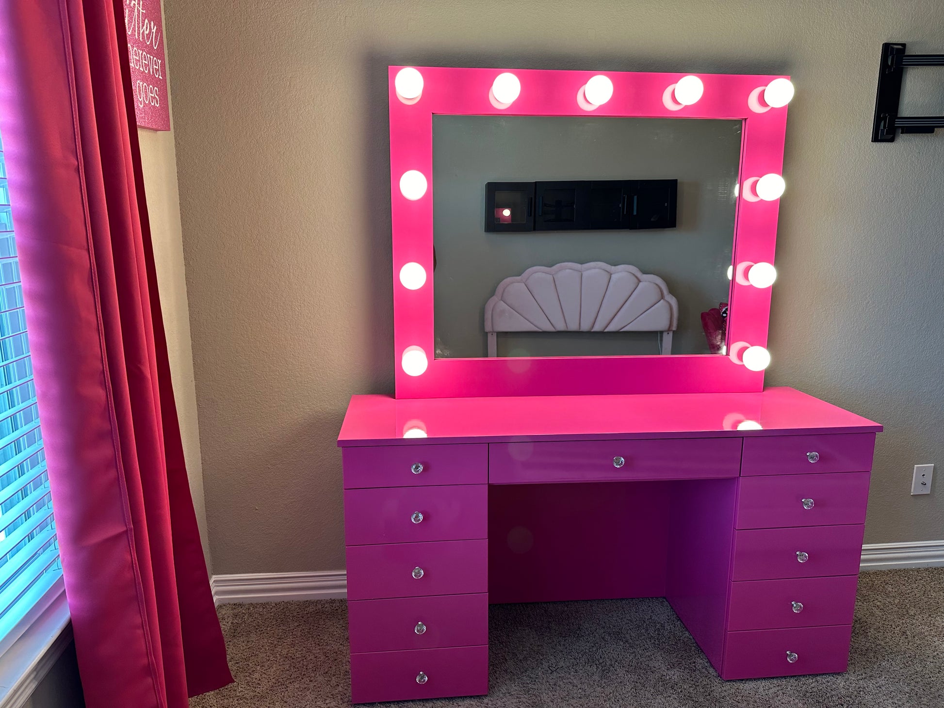 Handcrafted from high-quality wood, this Barbie Pink Vanity combines elegance and functionality. It features a wood top, 11 luminous light bulbs, 11 soft-close drawers, and a convenient plug-in phone charging station. Keep your space organized, illuminated, and ready for anything with this gorgeous addition to your room.