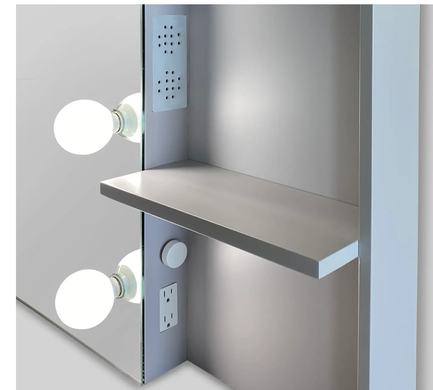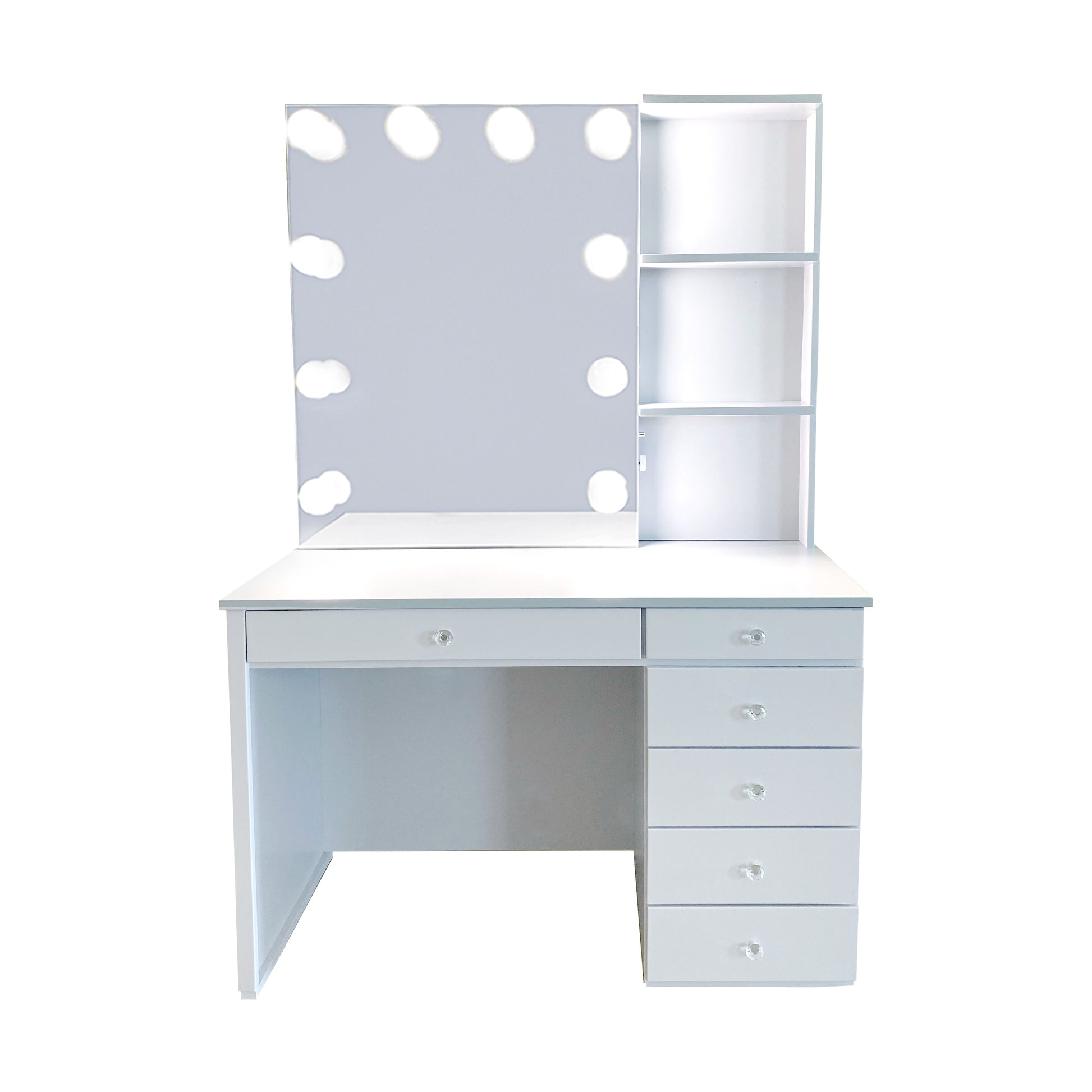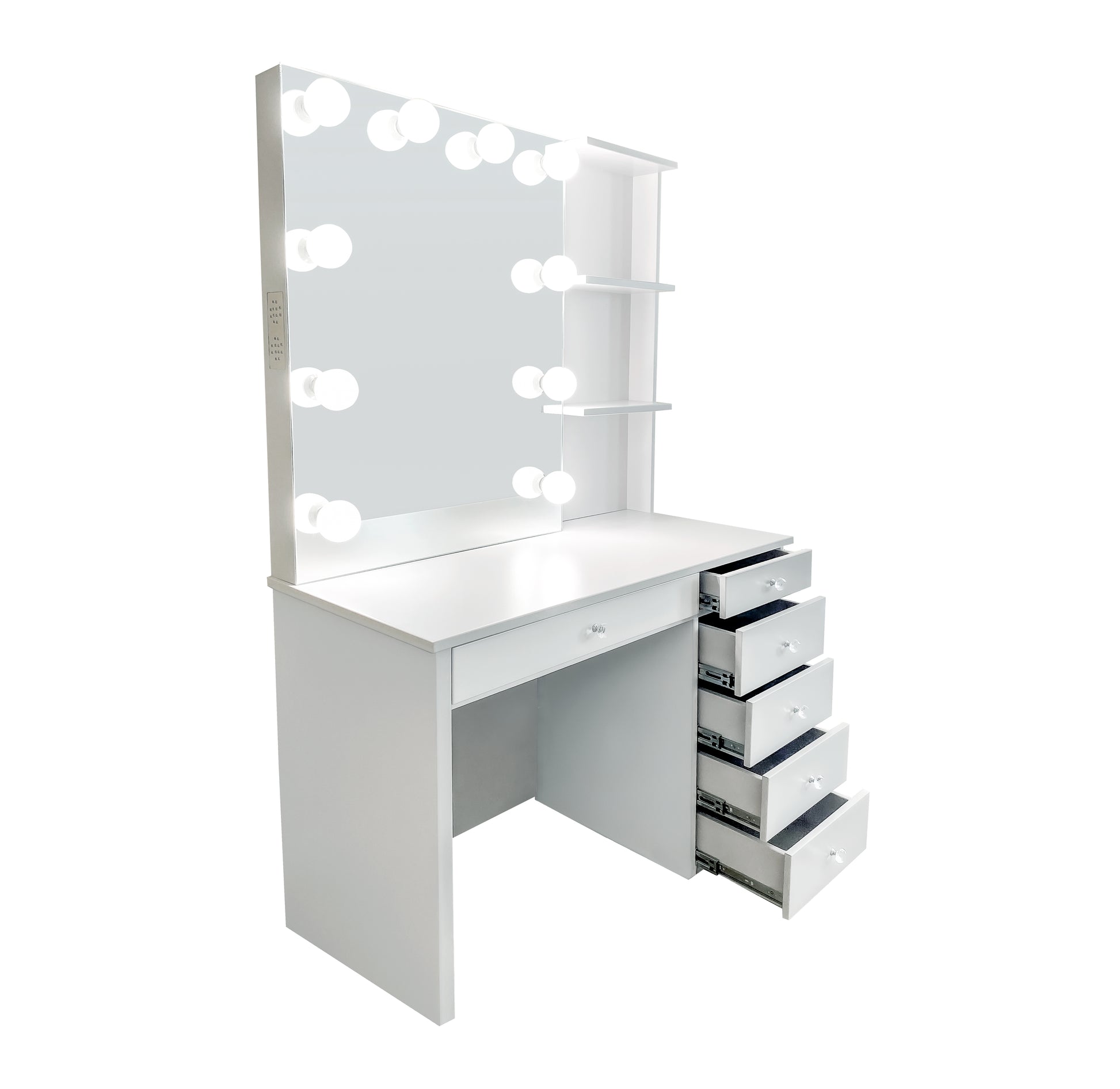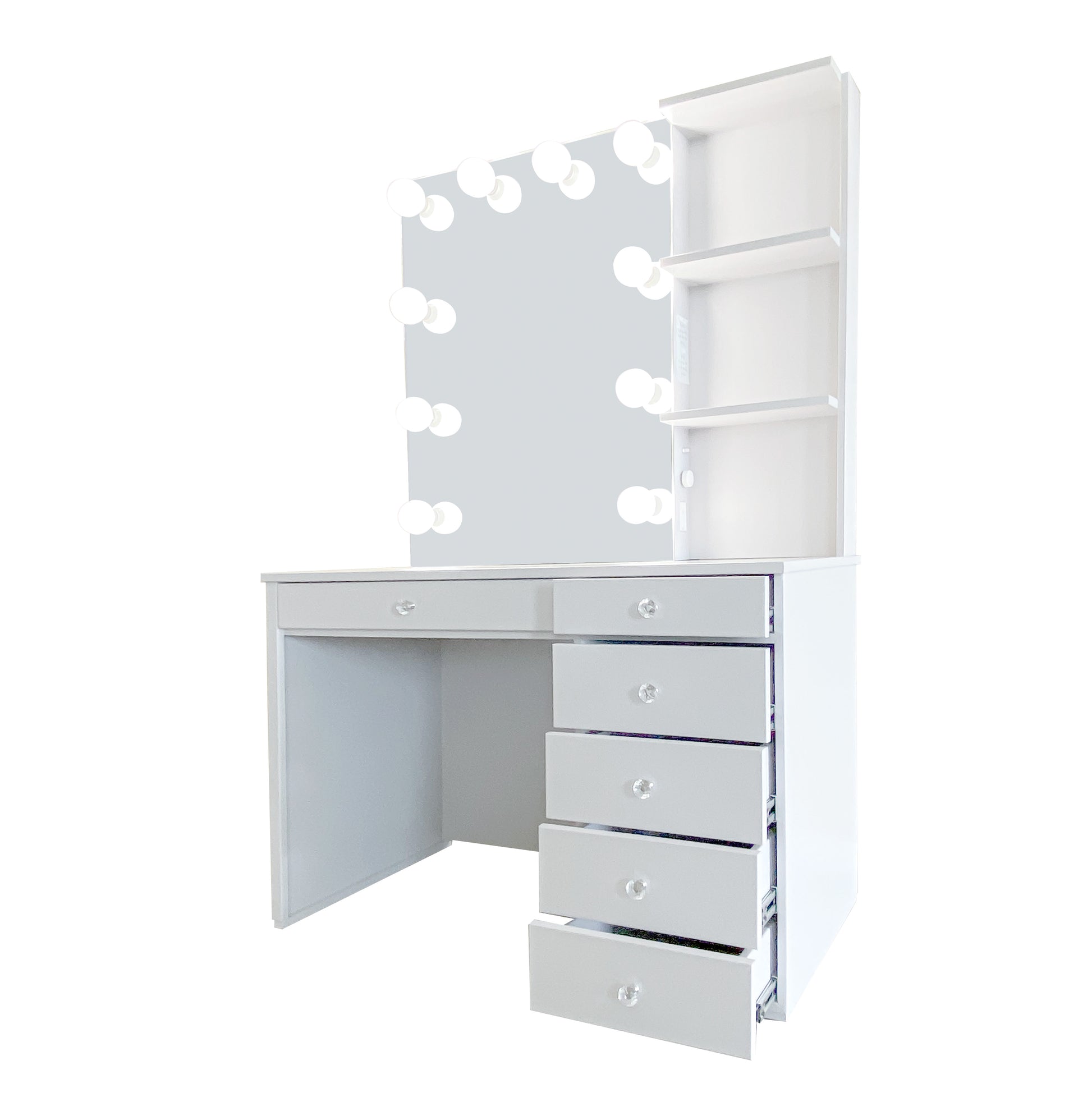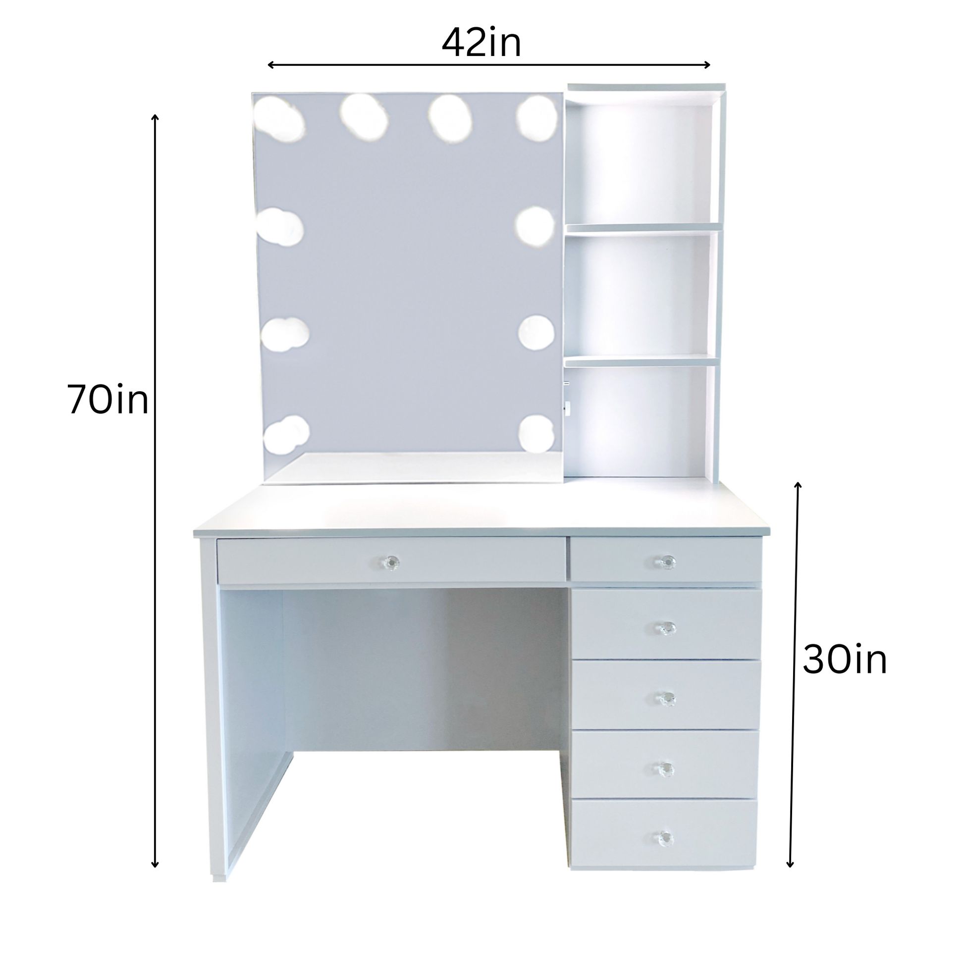 This dream vanity comes with 10 dimmable light bulbs it includes 3 shelfs to organize all your make up needs or to simply organize your room or make up room it has 5 drawers that measure 13inX16in and the middle drawer that measures 24inX16in and it comes with 6 crystal knobs