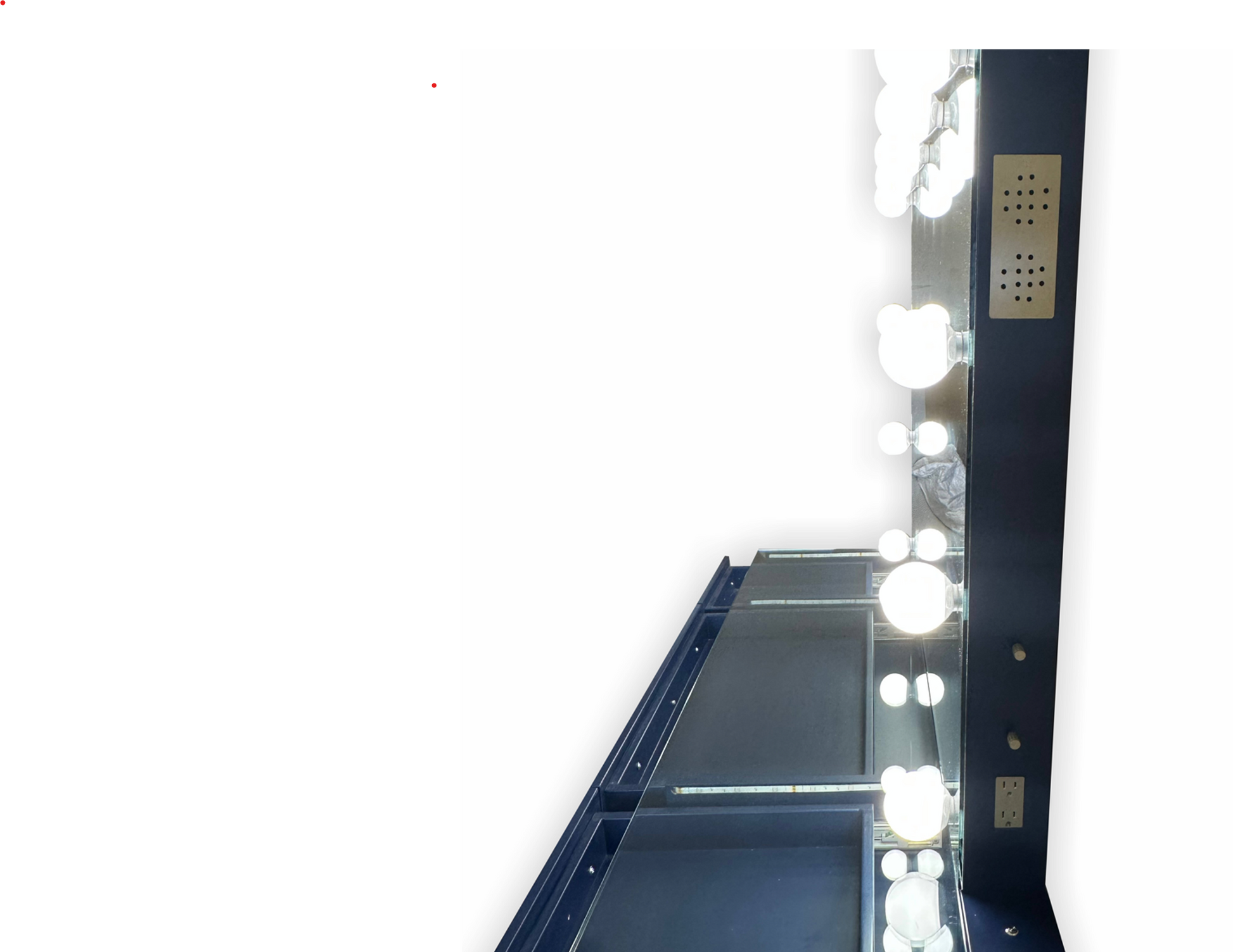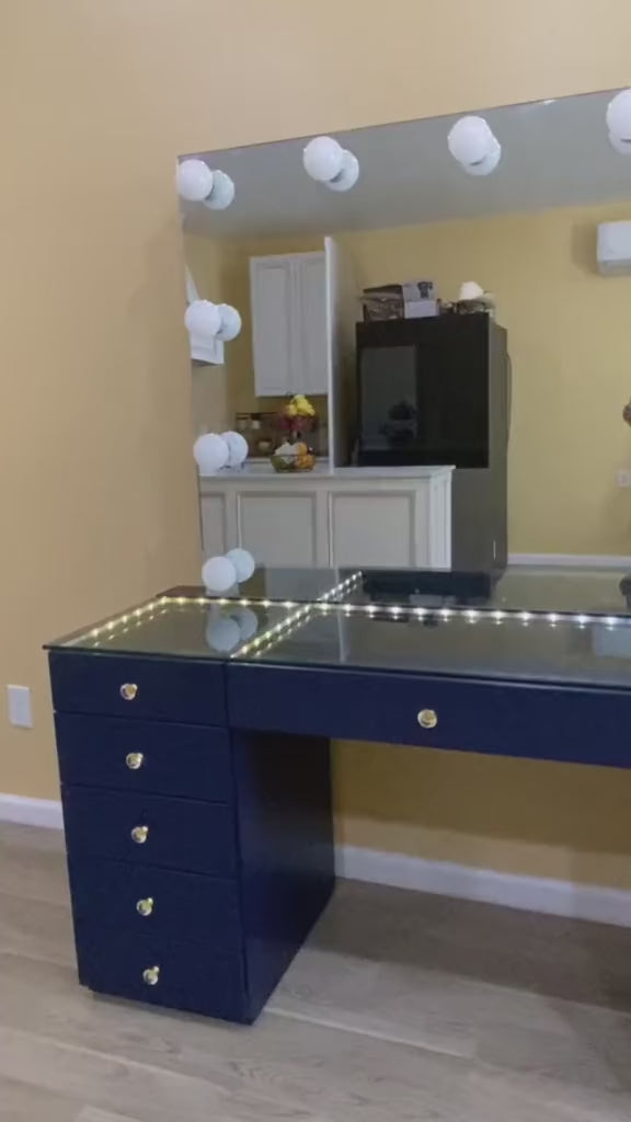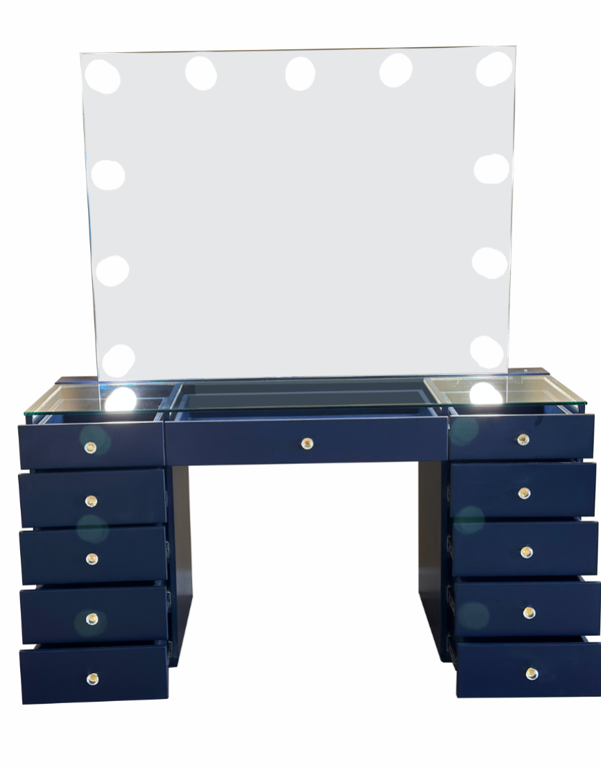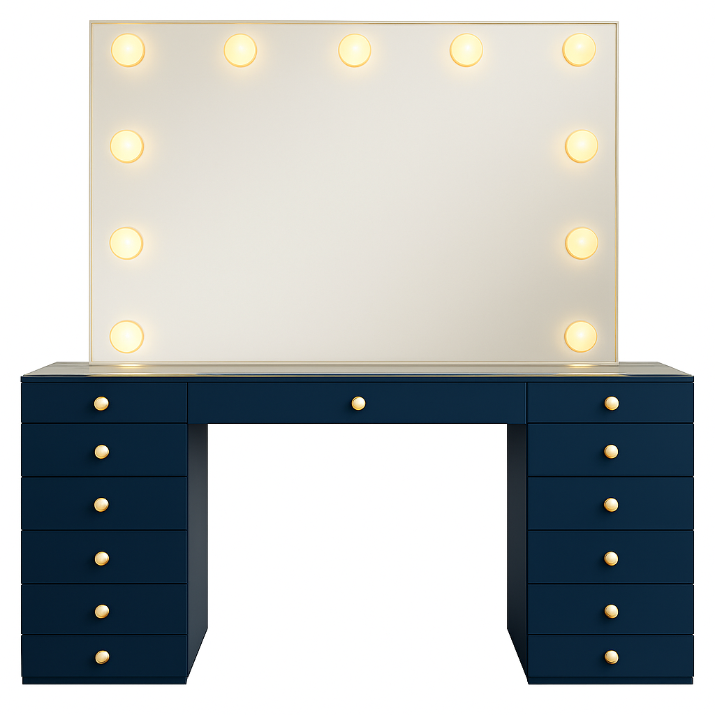 Upgrade your space with this navy-blue vanity, designed for both style and convenience. Featuring 11 dimmable light bulbs and a built-in 110V power outlet, this piece gives you the perfect lighting and functionality while you get ready.