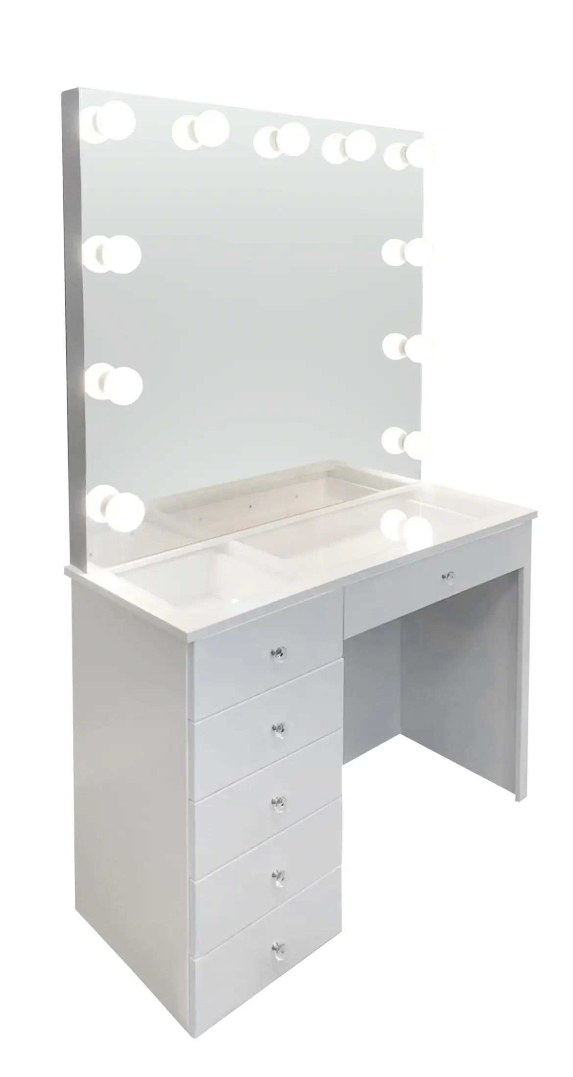 ⨠The Myself Vanity is your ultimate beauty companion! ⨠Featuring 11 built-in lights š” for perfect illumination and ample storage šļø with one large drawer and five side drawers, it keeps all your essentials organized. The sleek glass top ⨠adds a touch of elegance to any room, making your daily beauty routine effortless and stylish šš”.