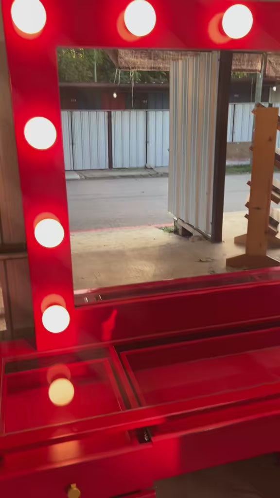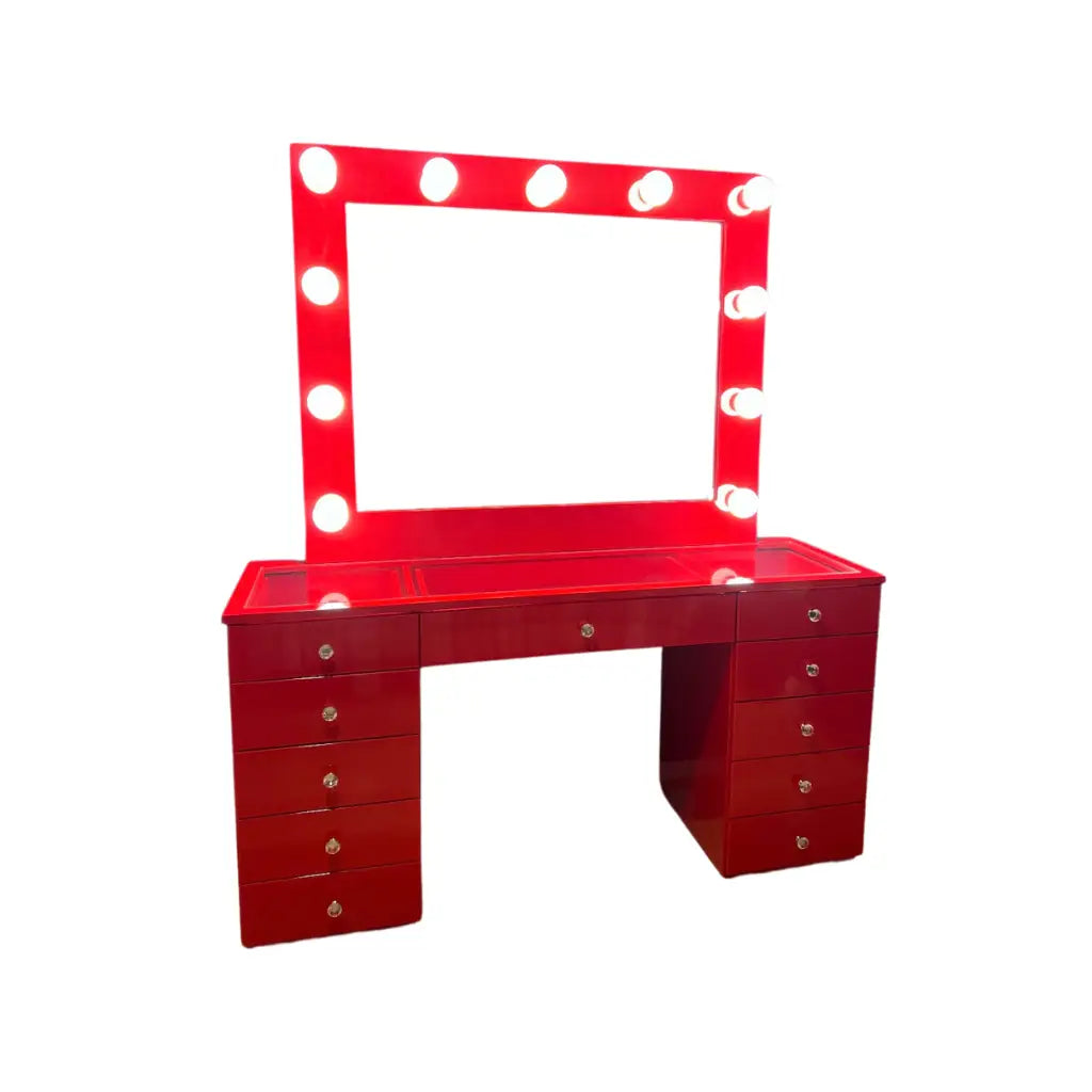 Expertly handcrafted and finished in a stunning red β€οΈ, the Rebel Vanity combines style and functionality perfectly. Featuring 11 spacious drawers ποΈ GLASS TOP andΒ 11 dimmable light bulbs π‘, it ensures optimal lighting for all your beauty routines. Complete with a sleek glass top β¨, crystal knobs π, Bluetooth π΅, and a 110V power outlet π, this vanity is the ultimate addition to any room.